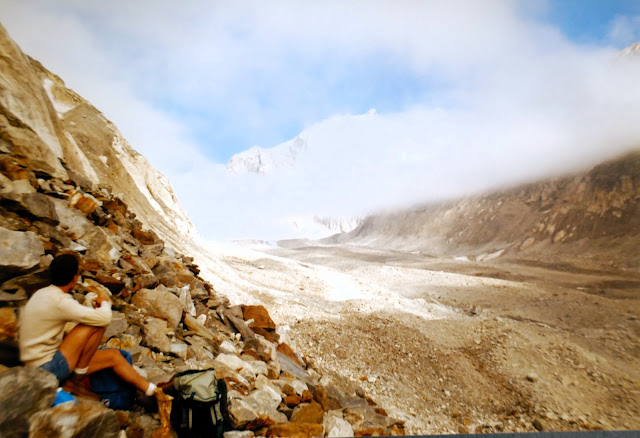 De ligging van de hut was ook mooi, aan de rand van de gletsjer, die zich aan één kant "naar beneden stortte" het dal in en vanaf daar dus grote scheuren in het oppervlak ging vertonen, zoals op onderstaande foto goed te zien is